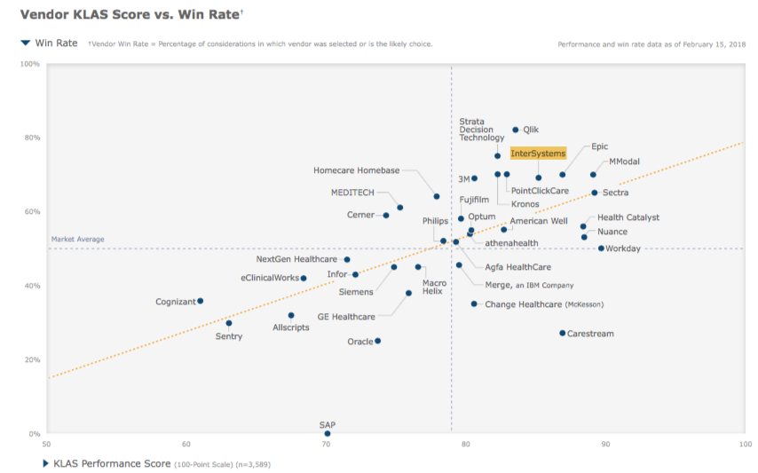Cambridge, MA, May 11, 2018 – InterSystems, a global leader in health information technology, today announced that KLAS Research has named the company an “A-list” vendor within KLAS’ newly released report, “Decision Insights 2018.” The analysis found that InterSystems has demonstrated a track record of high market energy, with high overall customer satisfaction and high customer retention scores.