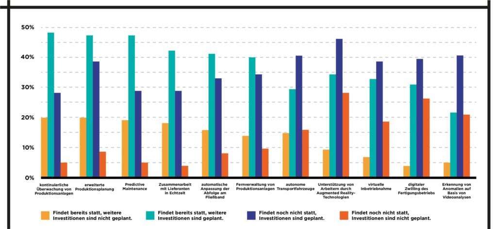 Die Unternehmen der Schweiz planen erste Investitionen vor allem in die kontinuierliche Überwachung von Produktionsanlagen (50 Prozent), autonome Transportfahrzeuge (50 Prozent), die erweiterte Produktionsplanung (52 Prozent) und die Erkennung von Anomalien auf Basis von Videoanalysen (54 Prozent). Die Zusammenarbeit mit Lieferanten in Echtzeit wollen 54 Prozent noch mehr als zuvor vorantreiben.