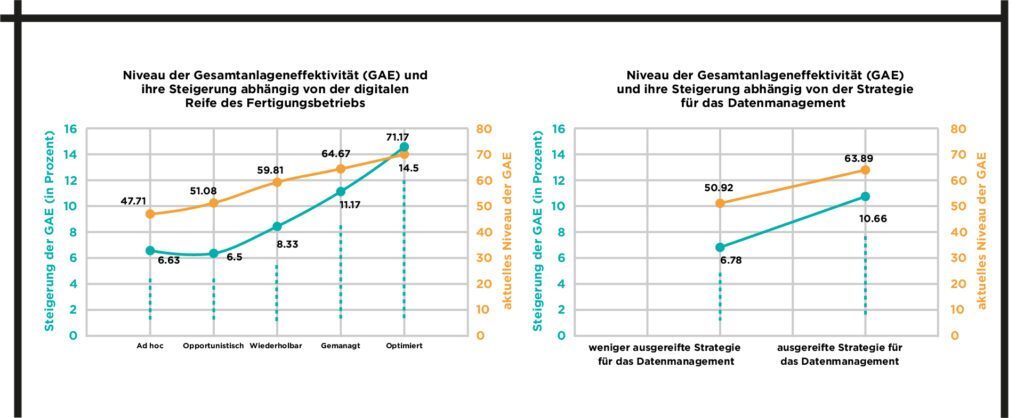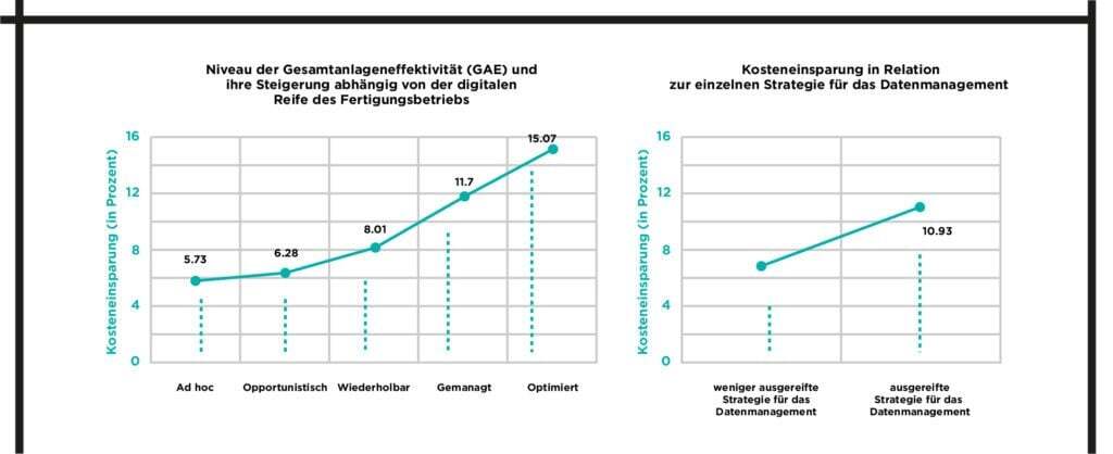 Die Investitionen in die Smart Factory bringen gemäß der Studie messbare Vorteile. Im Durchschnitt können die Herstellerfirmen so die Gesamtanlageneffektivität um 10 Prozent steigern und die Produktionskosten um 10 Prozent senken. Auch hierbei kommt es auf die jeweilige digitale Reife der Unternehmen und ihre Strategie für das Datenmanagement an. Je mehr sie ihre Daten mithilfe von KI nutzen, desto größer sind die Verbesserungs- und Einsparpotenziale und desto eher erreichen sie eine zuverlässigere, flexiblere und kosteneffiziente Produktion.