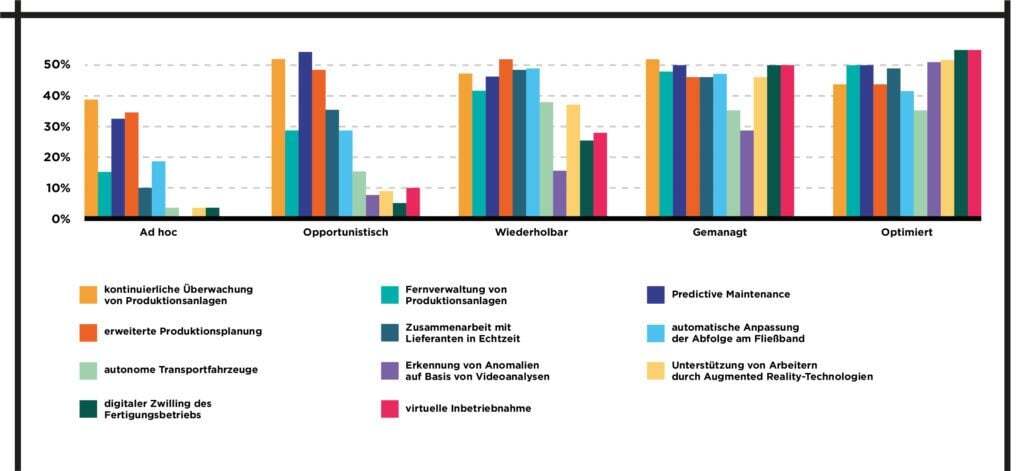 Es gibt einige Anwendungsfälle, in die bereits viel investiert wurde und die auch weiterhin ganz oben auf der Liste der Unternehmen stehen. Dazu gehören unter anderem die kontinuierliche Überwachung von Produktionsanlagen, die erweiterte Produktionsplanung und vorausschauende Wartung. Aber auch Investitionen in Anwendungsfälle, die bisher nur vereinzelt adressiert oder implementiert wurden, stehen für die Pioniere der Branche schon auf der Agenda. Nicht selten sind es sehr datengetriebene und besonders auf KI angewiesene Anwendungsfälle, wie beispielsweise die Erkennung von Anomalien auf Basis von Videoanalysen, autonome Transportfahrzeuge und ein digitaler Zwilling des Fertigungsbetriebs.