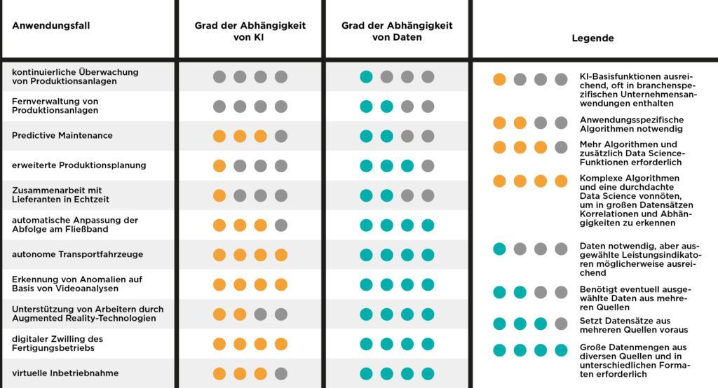 Die entsprechenden Anwendungsfälle stehen im Mittelpunkt der Studie. Diese unterscheiden sich hinsichtlich der Art der benötigten Daten und dem Nutzungsgrad von KI-Technologien.