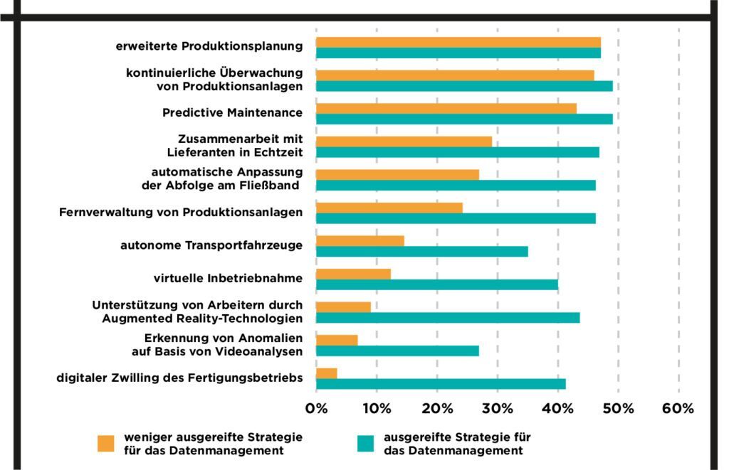 Unternehmen mit geringerer digitaler Reife realisieren dagegen eher Anwendungsfälle, die zwar auch datengetrieben sind, aber weniger KI benötigen, wie zum Beispiel die kontinuierliche Überwachung von Produktionsanlagen. Im Hinblick auf die Strategie für das eigene Datenmanagement fällt das Verhältnis laut der Umfrage in gleicher Weise aus.