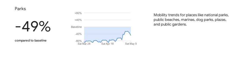 Figura 3 - Informe de movilidad en España de Google que muestra la disminución de la movilidad en comparación con la línea de base. También muestra un aumento en la movilidad ya que las personas podían visitar los parques durante horas específicas del día en la fecha del informe. Fuente: https://www.gstatic.com/covid19/mobility/2020-05-09_ES_Mobility_Report_en.pdf