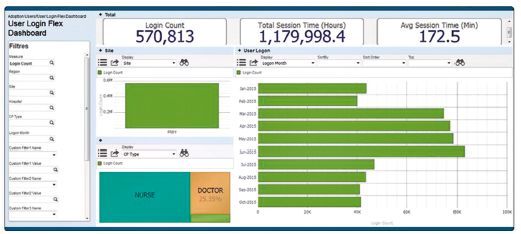 Il est donc possible d’analyser tout type de données, par exemple l’ensemble des données patients et épisodes, les fonctionnalités utilisées par type de professionnel, par unité de soins, etc., ou encore l’ensemble de la traçabilité d’accès à la base jusqu’au nombre de clics effectués sur un écran.