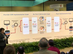 ブースでは、Da Vinciプロジェクトという民間主導の取り組みが紹介されていた。Da Vinci は、FHIR を活用し、関係者の間でデータを交換するユースケースを定義し、実装を行うことで、「Value-based(価値に基づいた)」医療の実現を目指すという興味深い試みである。
