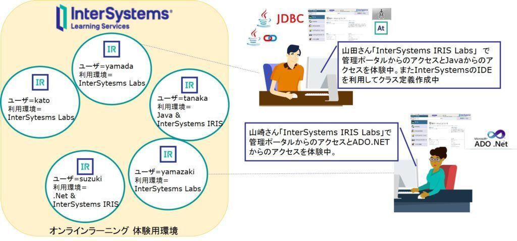 一方、オンラインラーニングでは、InterSystems 製品のサーバ側処理も含みますが、それ以外の外の世界から InterSystems 製品にアクセスする方法を解説するビデオ、体験できる演習環境付きコースを多数ご用意しています。
