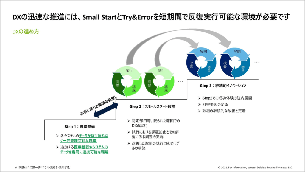 小さな試みの実践、それに伴う課題の改善、そして再試行、この繰り返しがDXの基本的な推進方法です。そして、このようなTry&Errorをスピード重視で進めるためには、データが分散配置された既存の病院情報システムの構成では困難を伴います。必要に応じて様々な仕組みを繋ぎ、存在する情報を収集し、適切なタイミング・条件下で活用可能なデータ活用プラットフォームが新たに必要になります。