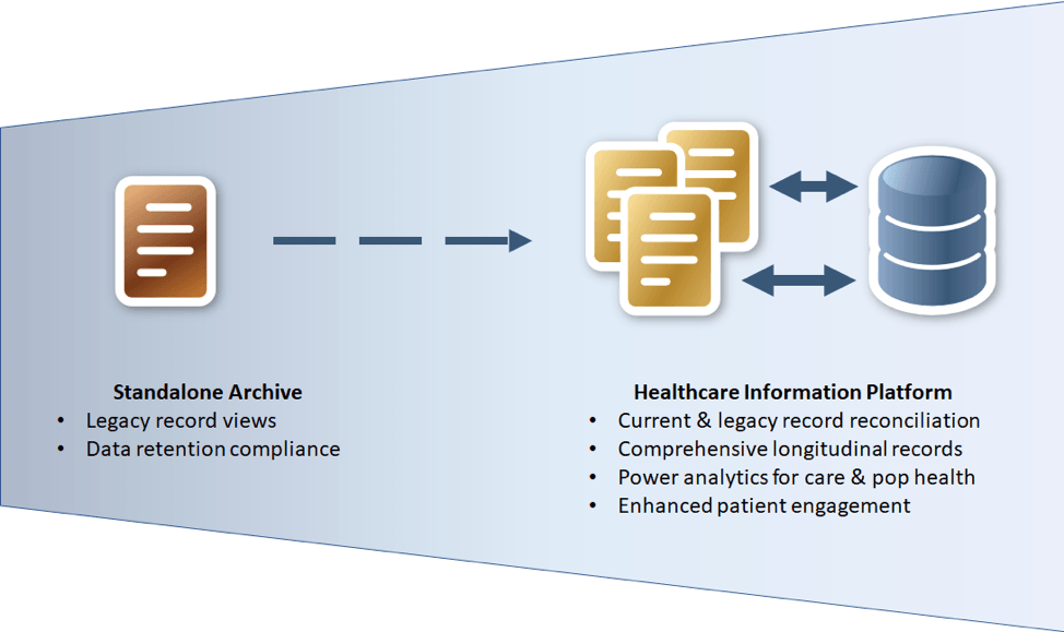 理想的なアーカイブソリューションは、強力な患者特定管理、高機能な分析、さらに重要な事は、アクション可能な方法で、レガシーデータをリアルタイムデータと統合することなど、医療情報プラットフォームのフル機能を提供します。