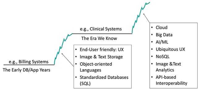 その後、多くの技術的ブレークスルーが起こりました— SQLデータベースの標準化、テキストや画像の保存と閲覧、そして最も大きかったのは、グラフィカルUIです。これによって、医師、看護師、患者などの専門的でないユーザが、ソフトウェアを使って、仕事や命を支援したのです。これが次の何十年間を経て、電子医療記録(EMR)の開発と導入に繋がりました。これは、医療ITにおける2つ目の成功へ平衡成功期間でした。