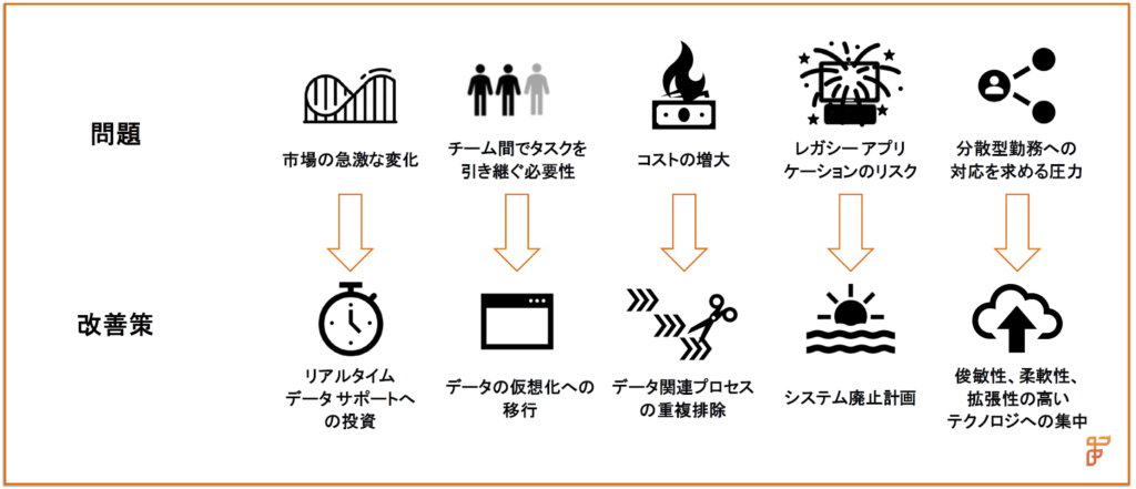 資本市場企業は、クラウド対応環境やクラウド ホスティング環境に移行したり、取引のライフサイクルの主要部分でプロセスを手作業からデジタルに転換したりすることを積極的に行ってきませんでした。新しく導入された次世代テクノロジ プラットフォームと、以前から引き継がれてきたレガシー テクノロジの間の非互換性は、データの問題を悪化させてきました。レガシー アプリケーションの段階的廃止には多大な時間と労力がかかりますが、企業はこうした制約に尻込みしてはなりません。将来、見通しのつくうちにデータ サイロが解消されることはないとしても、エンタープライズ データ ファブリックをはじめとする最新データ管理テクノロジに投資することで、企業全体にわたって分散したデータをつなぎ合わせられるようになるとともに、リアルタイムの分析能力と洞察が得られます。