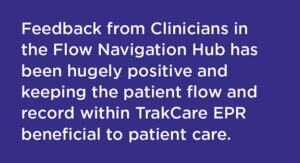 consultation, these electronic notes are then incorporated into the TrakCare ED Discharge Letters and sent back to GPs via an electronic feed. These notes are also added to the TrakCare EPR meaning they are visible should the patient require to be admitted to ED or referred to another service. Feedback from Clinicians in the Flow Navigation Hub has been hugely positive and keeping the patient flow and record within TrakCare EPR beneficial to patient care.