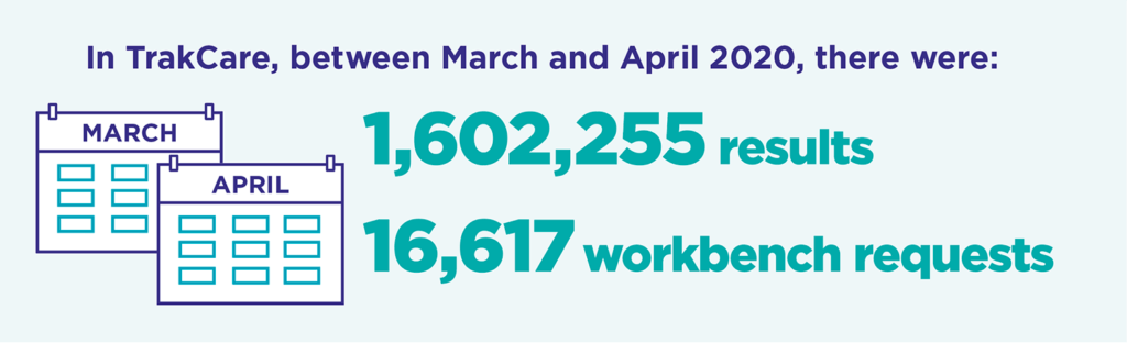 Staff in the CACs were quickly set up with InterSystems TrakCare as a way of co-ordinating the patient journey between the CAC, hospitals and other facilities. The advantage of using TrakCare was that it was the most practical and well tested solution for non-clinical and clinical staff to use. In addition GP staff working in the CACs used TrakCare to record clinic outcomes and place laboratory requests using TrakCare Order Comms and Workbench functionality for non-laboratory requests. Between March 2020 and April 2020 1,602,255 results were received in TrakCare and 16,617 workbench requests made.